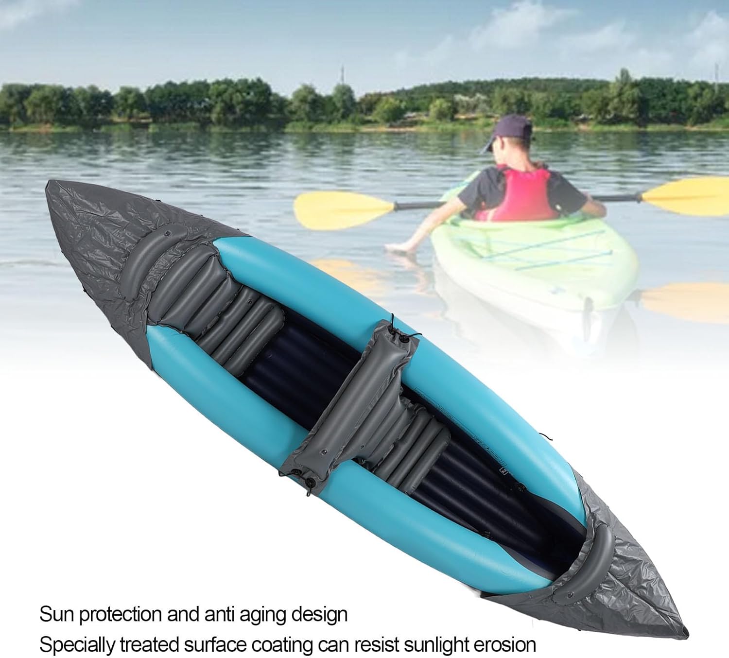 Heavy Duty Material: This foldable Kayak boasts a recently upgraded thickened material, enhancing its resistance to wear and ability to stay steady on water. It provides a safer and more reliable option for water exploration. Excellent Waterproofing: Made with water resistant material, the folding kayak effectively prevents water penetration ensuring the inside stays dry. Additionally, the material is odorless, promoting a comfortable user experience. Superior Sun Protection and Aging Resistance: The special surface treatment resists sun damage, ensuring the kayak stays vibrant, even when exposed to the sun for extensive periods. Its exceptional anti aging performance contributes to an extended lifespan. Easy Folding and Stand Upright Function: The inflatable canoe features a quick foldable design for easy carrying and storage. Its rigid bottom supports standing operations, enhancing stability whether you're sitting or standing. Multilayer Bottom and Independent Air Chamber Technology: Equipped with a reinforced multilayer bottom, the foldable kayak offers increased load bearing capacity and abrasion resistance. Each air chamber inflates independently, providing sufficient buoyancy even if one chamber is damaged, ensuring a safe return.Item Type: Inflatable Kayak Material: PVC