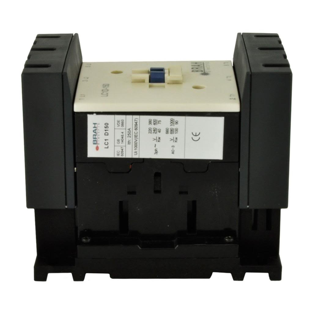 Aftermarket Direct Replacement for TELEMECANIQUE AC Contactor LC1-D150 - Manufactured by BRAH ELECTRIC. 3 Phase 3 Pole 600 Volt 150 Amp, Coil Voltage = 120 Volt Coil. There is 1 normally open and 1 normally closed auxiliary contact. This is an AC magnetic contactor, which is to be used in the LC1-D series motor control systems. It comes complete with a 1 year warranty from the manufacturer. It is guaranteed to work with your system.