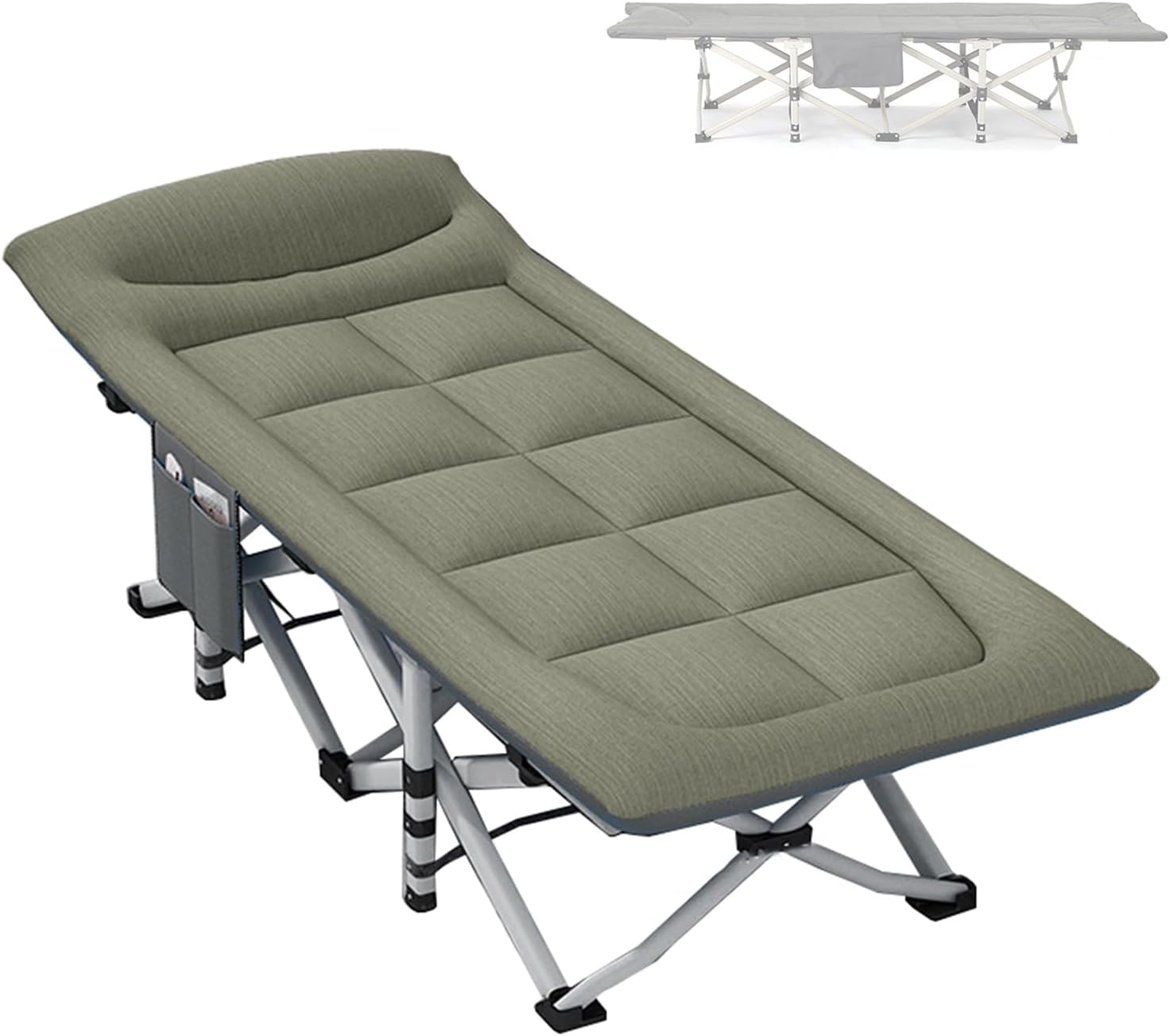 Features:The cushion is integrated with the camping cot,no need to disassembleIn contrast to others with no pillow and full flat, ours feature an ergonomic pillowEasy to assemble and disassemble, convenient to take for travelComes with a side pocket with classified storage, put your personal items within reachSuitable for various outdoor activities, such as campsites, beaches, offices, hospitalsSpecifications:Overall Dimension: 190x68x40cm Load Capacity: 330 lbsPackage includes:1 x Folding Camping CotCaution.1. Due to the different monitors, there may be a slight color difference.2. Due to different measuring tools, there may be 1-3 cm error.