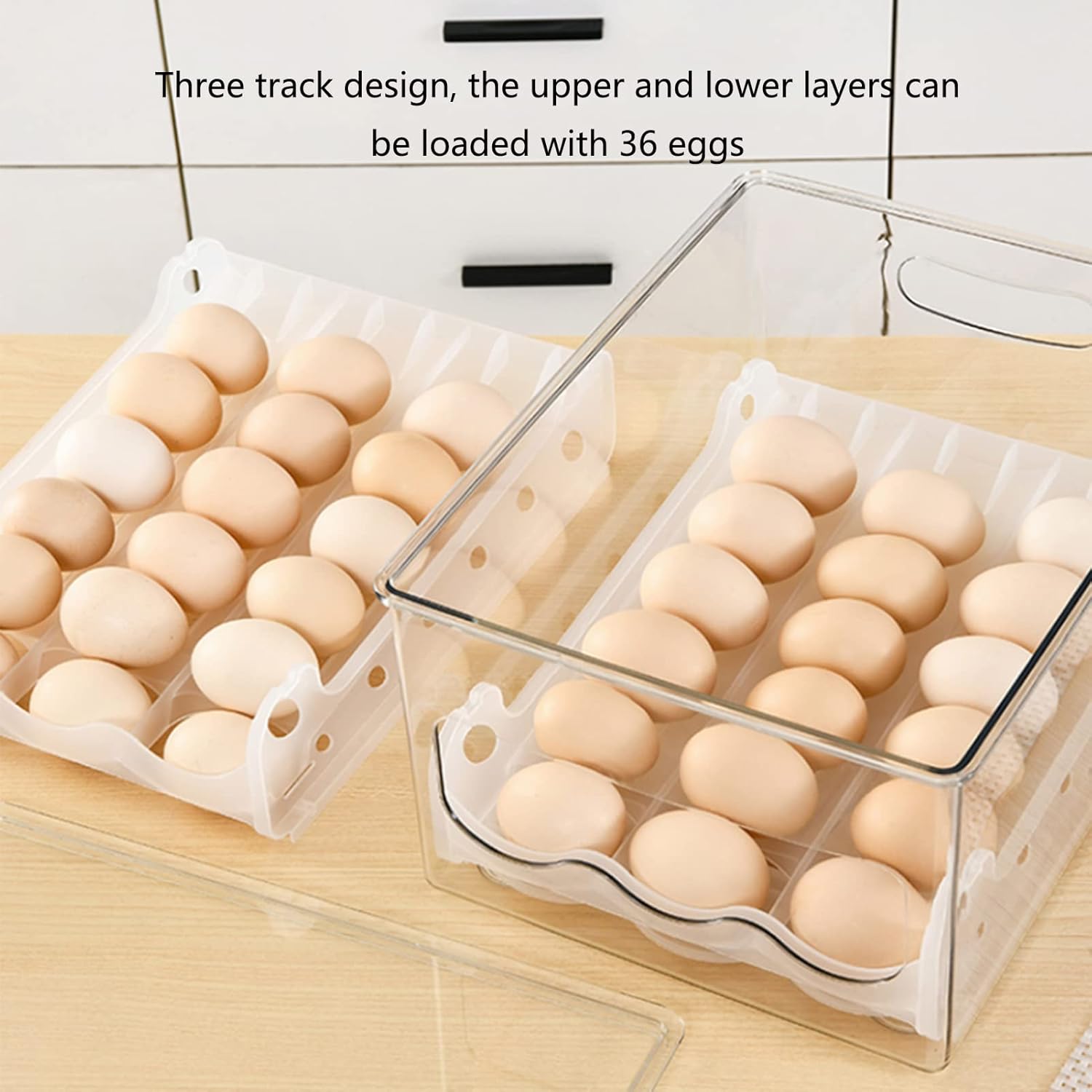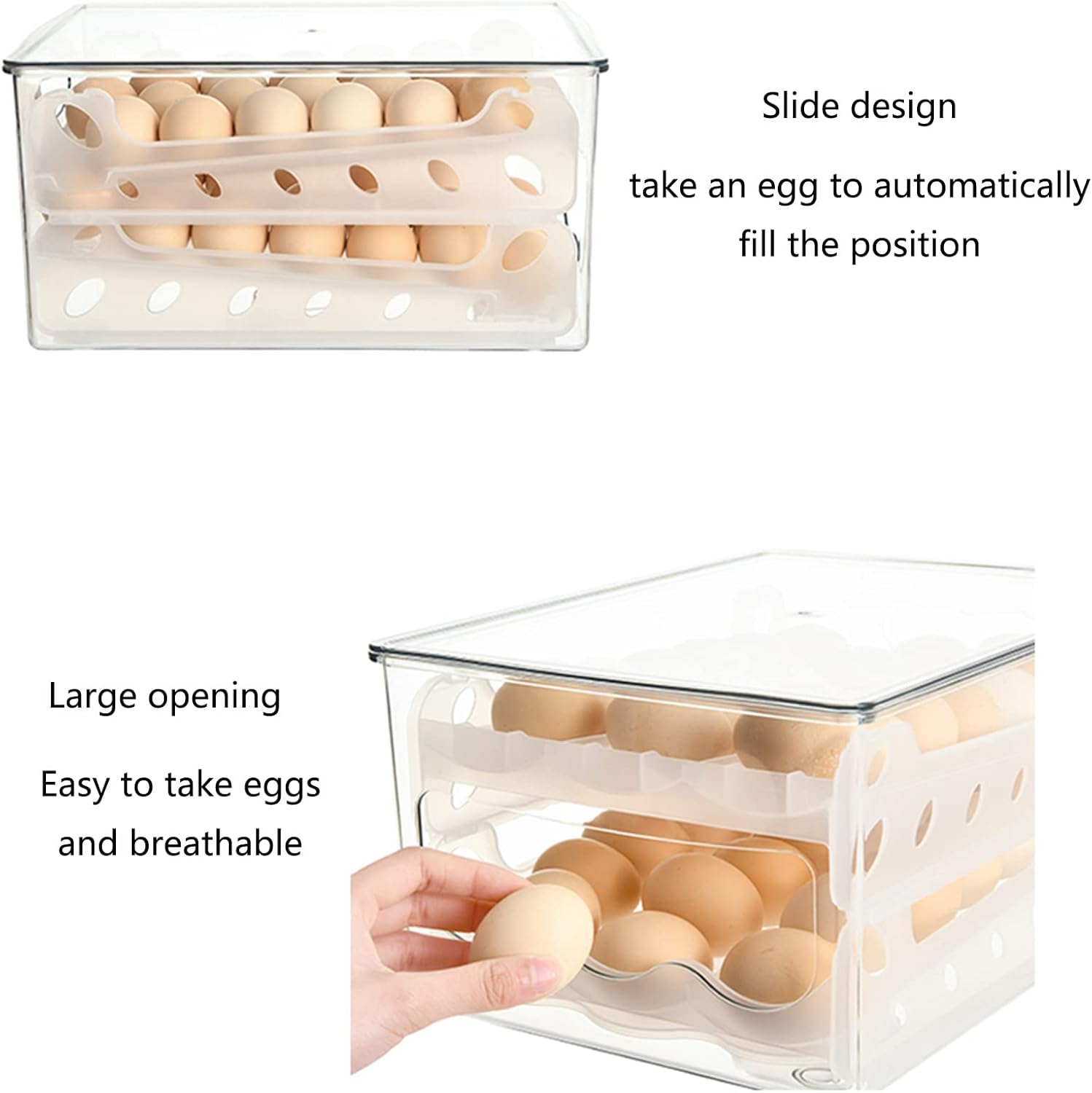 class="a-text-bold">The Unique Drawer Design Makes It Easier To Take Eggs;The Transparent Egg Carton Is Clearly Visible,Making It Easy To Replenish Eggs In A Timely Manner.Fixed Egg Tray Can Prevent Eggs From Shaking And Breaking,And Can Be Stacked For Storage,Neat And Beautiful,Saving Space And Keeping The Refrigerator Organized And Clean. Name:Double Egg Rolling Box Material:PP+Pet Style:Japanese-style Storage Scene:Kitchen Function:Refrigeration,Organization,Storage Size:31.5x24x16cm (12.4x9.4x6.3inch)