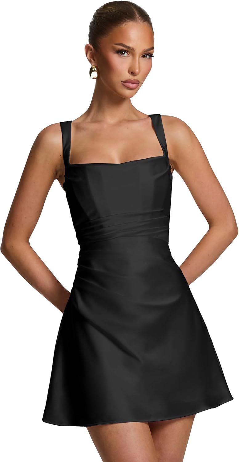 | Embellishment Feature | lace up satin evening dress for women, mini formal dress satin square neck, ruched waist prom dress short, satin mini cocktail party dress, women's short satin homecoming party dress |
