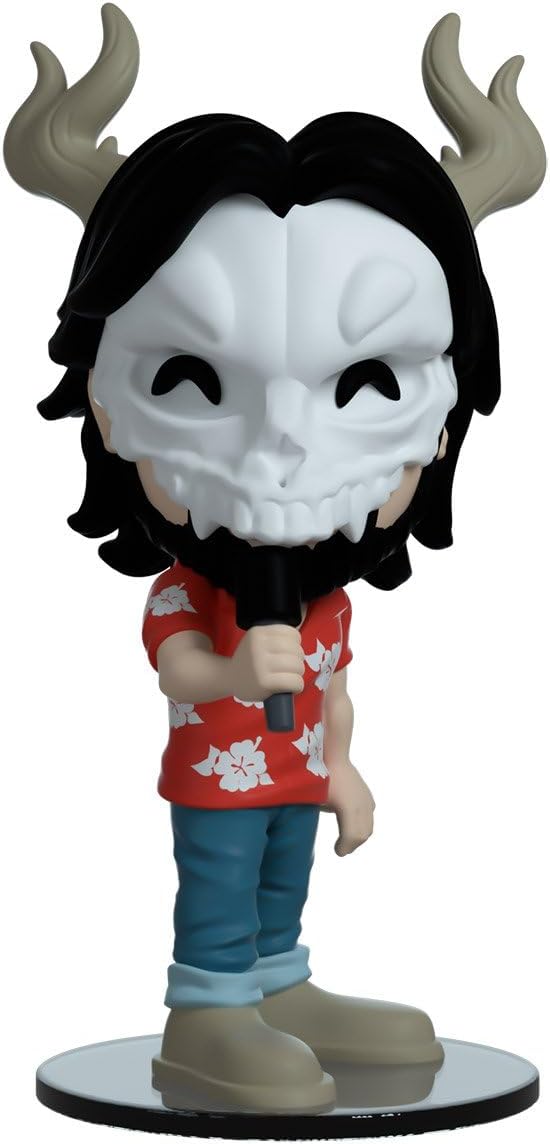 The Collectible: Standing at 5.2 inches, Wendigoon makes his appearance at Youtooz! His long jet black hair is styled to perfection. Over his face, he is wearing a white skull mask, with the mask's horns sticking out from the top of his head. He is dressed in a red button-up shirt with a white floral pattern printed on it paired with a pair of blue jeans underneath. His left hand rests by his side with his right hand holding onto a mic that is close to his mouth. He is posed with his head looking over his right shoulder. The exterior of his double-walled packaging shows an extremely dark forest with mysterious and bright eyes peering through the bushes. The interior is the inside of a dark and cold looking cave with very sharp rocks growing from the ground up.